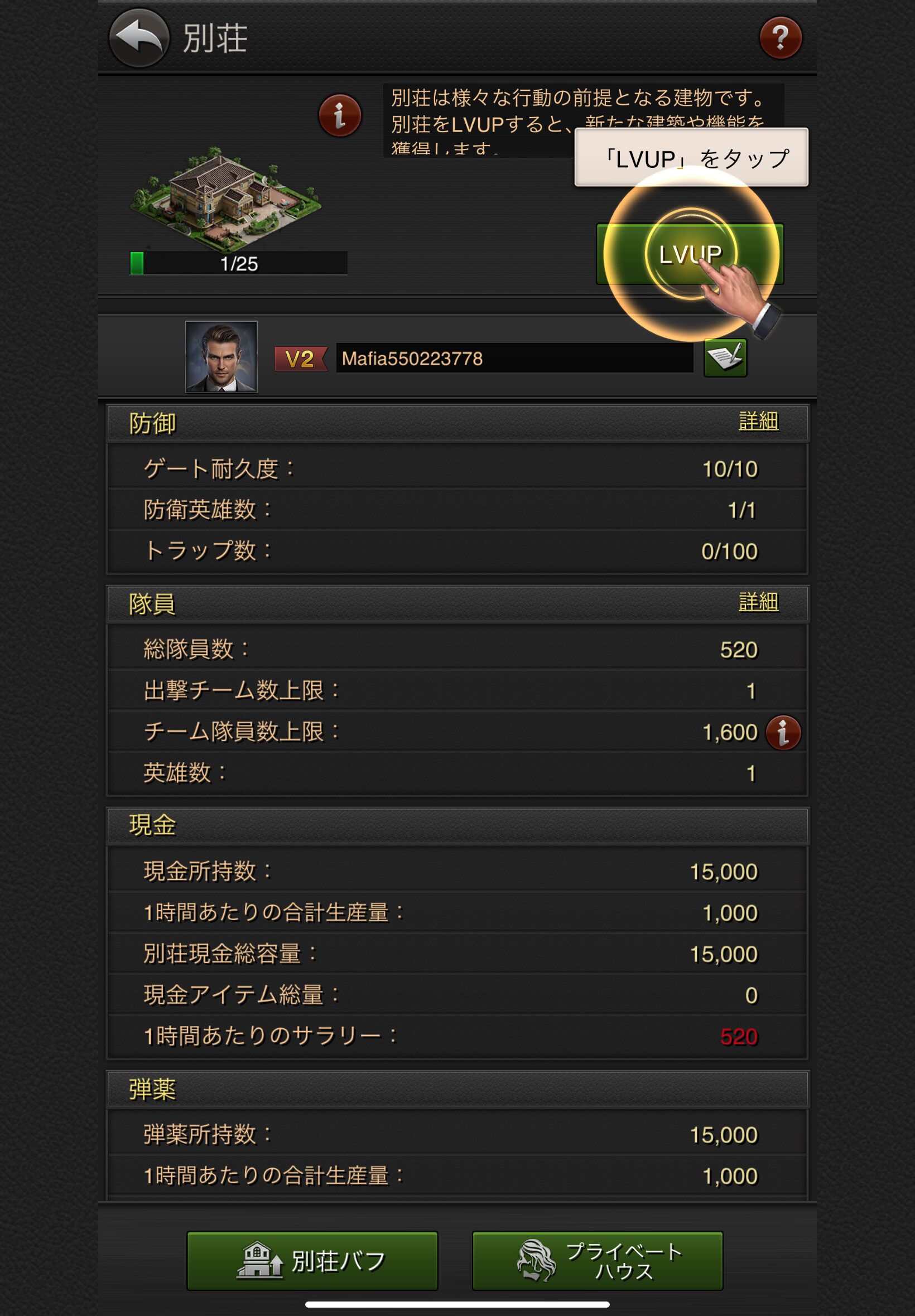 次に、別荘を中心にレベルアップを進めていきます。