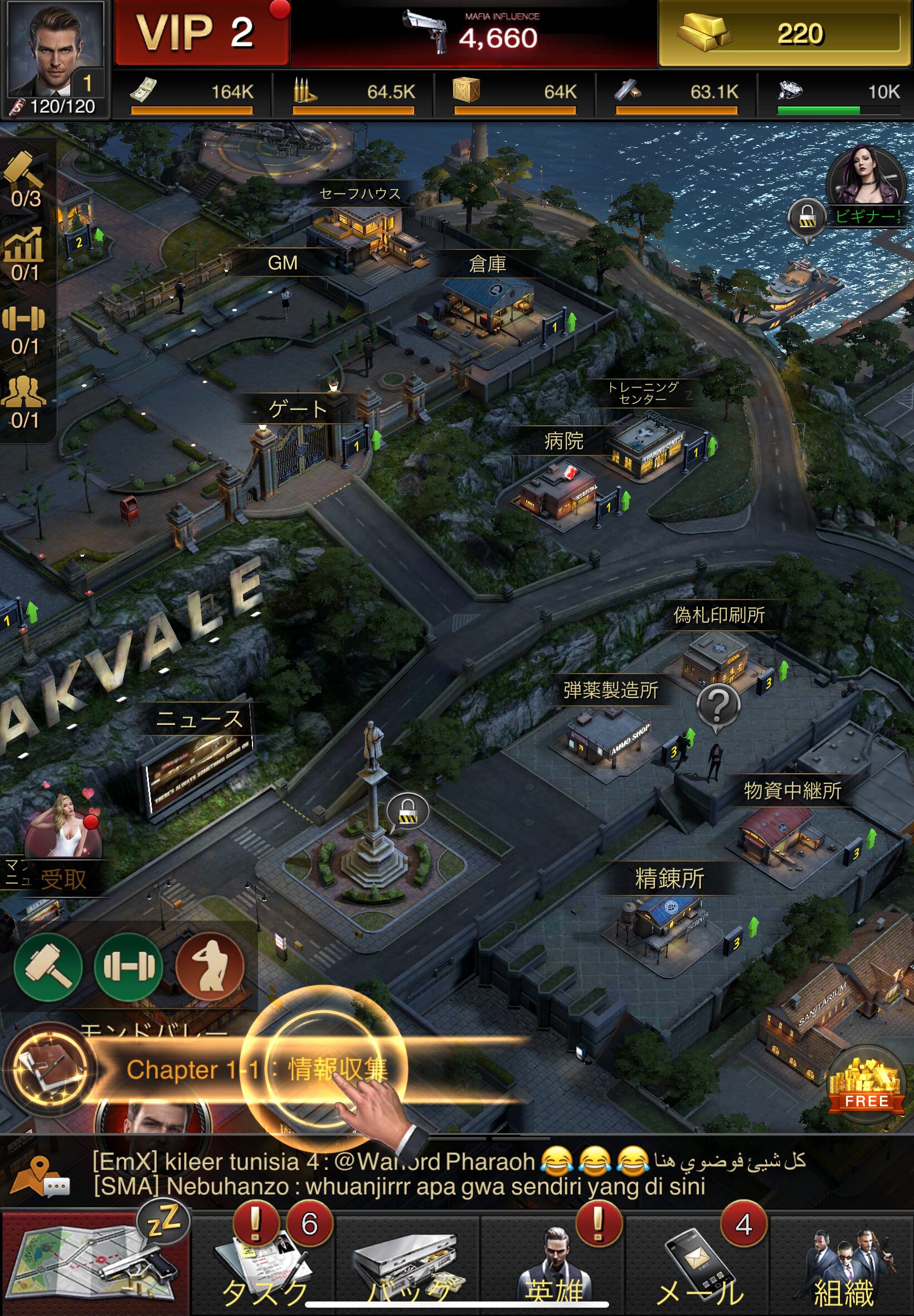 最初は資源を生み出す施設(偽札製造所、弾薬製造所、物資製造所など)を建設し、